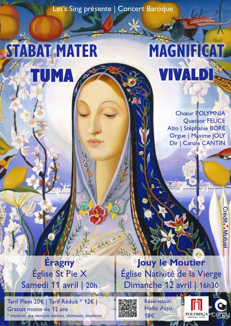 L’ensemble vocal POLYMNIA, dirigé par Carole CANTIN, vous convie à ses deux concerts de musique baroque autour d’œuvres dédiées à Marie. Au-delà de leur caractère sacré, les œuvres qui seront données vous transporteront par la richesse des émotions qu’elles suscitent, servies par l'énergie, la variété et la beauté de ce style de musique polyphonique. Ces concerts s’inscrivent dans la volonté de l’association Let’s sing via son Ensemble vocal Polymnia de proposer des programmes originaux, associant des œuvres connues à des pépites à découvrir et accessibles à tous.